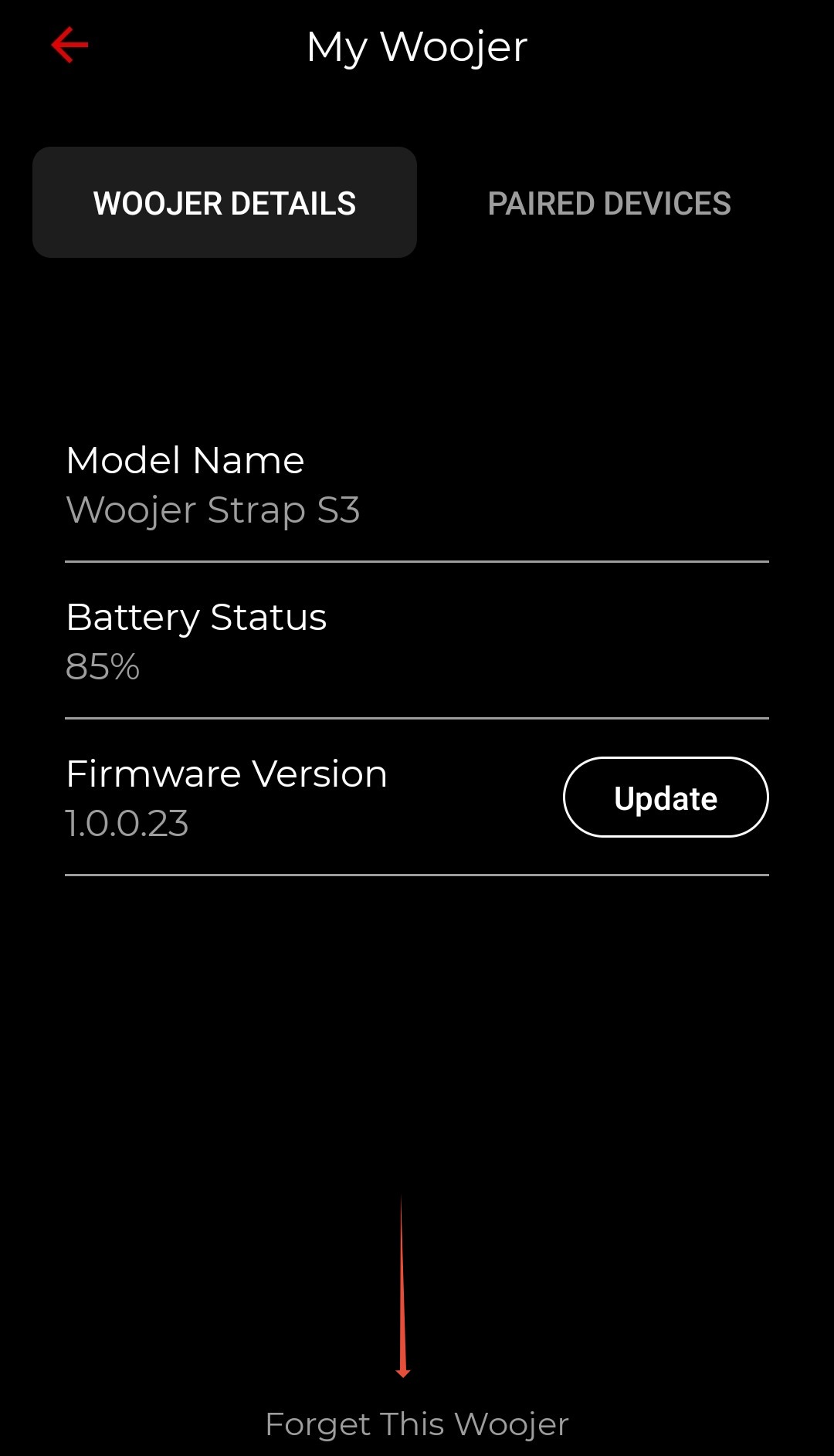 - Under the "Woojer Details" pane you'll be able to see a "Forget this Woojer" button. Please click it to remove the currently associated Woojer from the app.