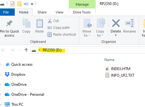 Keep the buttons pressed until a new device named RP2350 appears on your PC (See photo below).